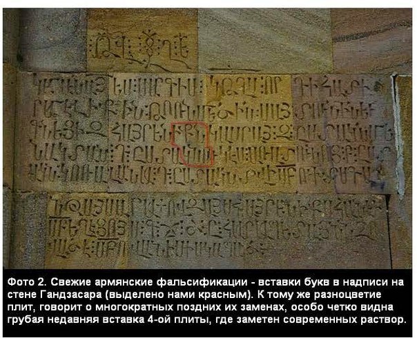 «Следует отметить, что широкое поле для искажений и фальсификаций при переводе надписей Гандзасара со стороны армян открылось из-за того, что в древности писали, не разделяя на слова и без гласных (вместо которых ставили символ, обозначающий несколько разных гласных)».