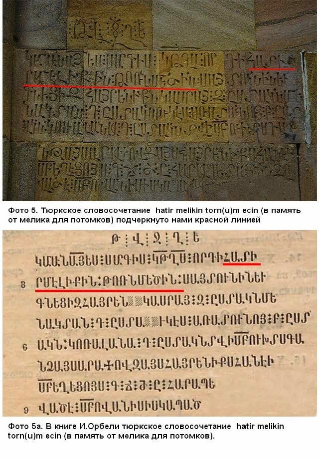 | Фото 5, 6: Тут лишь добавили желаемую букву, чтобы придать слову этимологию тюркского происхождения. Присоединили первую букву одного слова к окончанию другого – тюркизм готов. В действительности же написано следующее: hatir Meliqin torn mecin. Как видим, никаких тюркизмов. Примитивная подгонка под тюркское. Давайте каждое слово рассмотрим отдельно. Слово hatir (հատիր) – 1. Делить, 2. Пересекать. Meliqin- Мелик – армянское имя от месопотамского Малик (князь, владыка, царь), а окончание ИН – определенный вид. Torn : Тоr – внук. Окончание Н – определенный вид. Mecin: Мец-большой, великий. Окончание Н - определенный вид. Таким образом, это словосочетание переводится как: Пресекай Мелика, внука старшего. Но азербайджанские фальсификаторы в этом словосочетании упустили слово Vordi. Данное словосочетание начинается именно так. Начало и конец этих слов четко обозначено тремя вертикальными точками в начале. Просто слово «води» (сын) никак не смогли вписать в логику «тюркского выражения». А что касается слова «торун», так это слово попало в турецкий из западно-армянского диалекта, и означает не «потомки», а «внук». В западно-армянском диалекте, в качестве определенного вида употребляется окончание -ун. |
