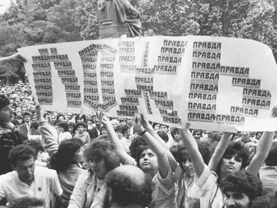Крайним образом изменились лозунги и тезисы. Советская армия стала именоваться "оккупационной". В связи с разгоном протестов появилось вот такое выражение, используемое на протестных плакатов: