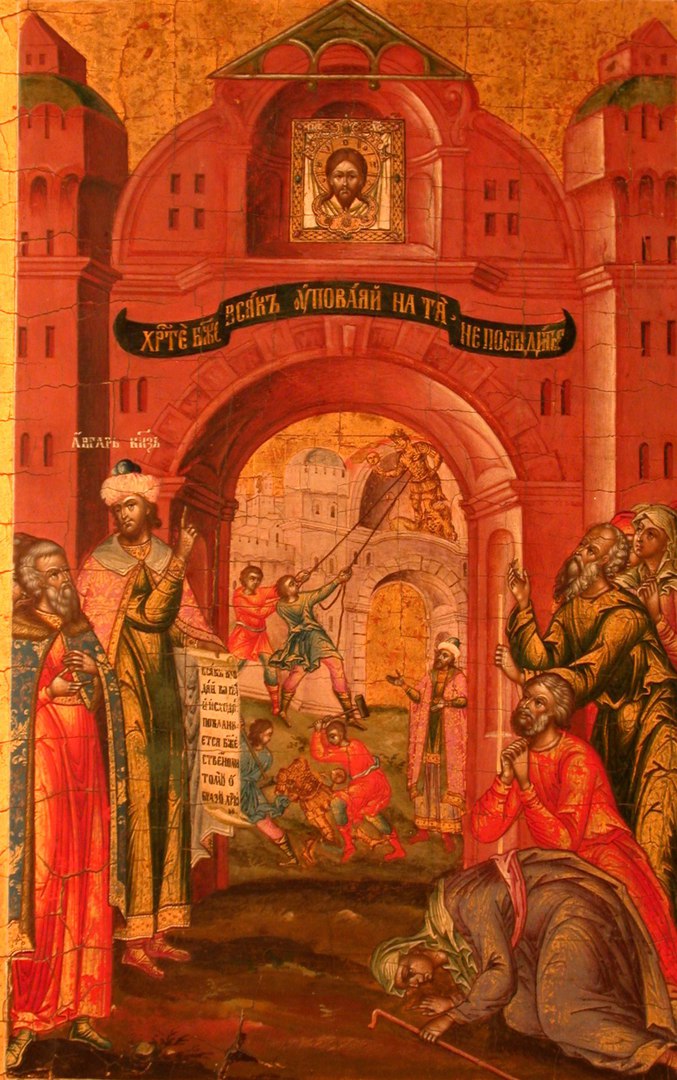 После Абгара трон унаследовал его сын Ананун (в переводе с армянского – Безымянный), который вскоре забыл пример своего премудрого отца, впал в язычество и сделался жестоким гонителем христиан. Абгар поставил образ над городскими воротами, украсив его. Сын Абгара Ананун, заразившись идолопоклонством, хотел было снять образ с ворот и заменить его идолом, но епископ, вследствие видения, ночью заложил его камнями. Прошло около пяти столетий, и совершенно забыли об образе. В 545-ом году персидский царь Хосров с многочисленным войском осадил Эдессу. Осажденные, видя неминуемую свою погибель, обратились с молитвою к Богу, и Сама Пресвятая Богородица явилась епископу города Евлалию во сне и сказала, чтобы он открыл находящийся над воротами Нерукотворный образ Спасителя, и тогда город будет спасен. Епископ на другой же день обрел Образ, и оказалось, что он совершенно цел, пред ним горит 500 лет тому назад зажженная лампада, и на кладке «чрепии» возведенной для закрытия Образа, запечатлелся Лик Спасителя, подобный Лику на самом Нерукотворном Образе. Тогда неприятели легко были отражены.