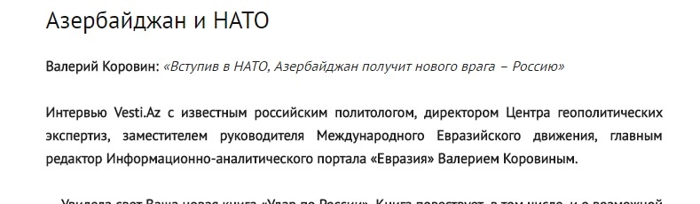 Ему вторит Коровин: «Азербайджан превратился в единственного союзника России. И это факт. Что касается Грузии, то она самой первой была захвачена американцами. На данный момент именно с Азербайджаном у России налаживаются самые стратегические отношения».