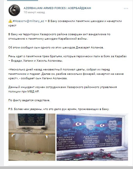 Не позволив себе усомниться в достоверности измышлений азербайджанских Шерлоков предположу, что это действительно дело рук армян проживающих в Баку. Учитывая численность армян в столице широкошагающего вывод один: убийца -дворецкий (зачеркнуто) вандал - член бакинской платформы мира.