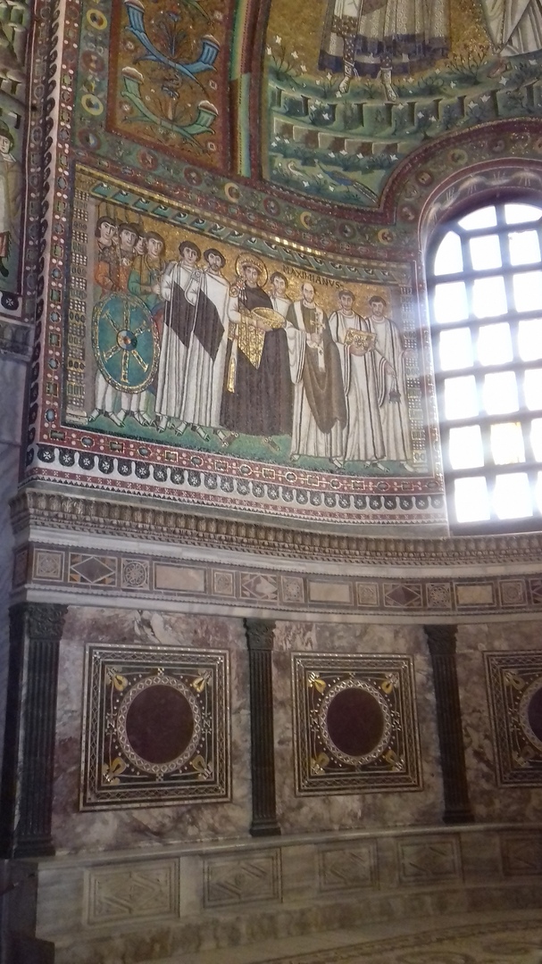 В 540 году армия Велизария осадила и завоевала Равенну, включив ее в состав Византии. Вилизарий имел огромный опыт ведения боевых действий, а начинал свою службу простым солдатом гвардии императора Юстиниана I. В 525 года н. э., во время войны с Ираном, Велизарий командовал небольшим отрядом, действовавшим в Персидской Армении. Главным соперником Велизария был полководец Восточной Римской империи армянин Нерсес, который наряду с Велизарием стал одним из первых великих полководцев раннего Средневековья и даже больше. В разные периоды истории Нерсесу удалось покорить остготов, вернуть Юстиниану контроль над Адриатикой и даже взять Рим. А если не брать в расчет то, что до второго прибытия Нерсеса в Италию под властью империи оставалась Равенна с ее окрестными землями, то армянского византийского полководца можно по праву считать единственным за всю историю военачальником, сумевшим покорить весь Апеннинский полуостров. Этим он и заслужил признательность императора Юстиниана I – православного правителя Равенны и Римини. Находясь в Равенне, я не мог не посетить православный храм византийского стиля Сан-Витале, который, к тому же, является визитной карточкой города. Большая часть базилики была заложена в 527 году, а все остальные позже с разницей в 100, а то и 200 лет. Здесь, в основной части базилики Сан-Витале, один из потолков украшен мозаикой, в центральной части которой изображен Юстиниан I, а справа от него сам полководец Нерсес, вернувший императору власть над Адриатикой. Не скрою, гордость от такого соотечественника так и распирала. И не только за этого соотечественника. В том же Сан-Витале находится саркофаг экзарха Равенны в 625-643 гг. Саака Армянина, или, как его называют в католической традиции, Исаака Армено. Останки главы Равенны помещены в саркофаг вместе с останками его супруги Сусанны. А на самом саркофаге надпись: