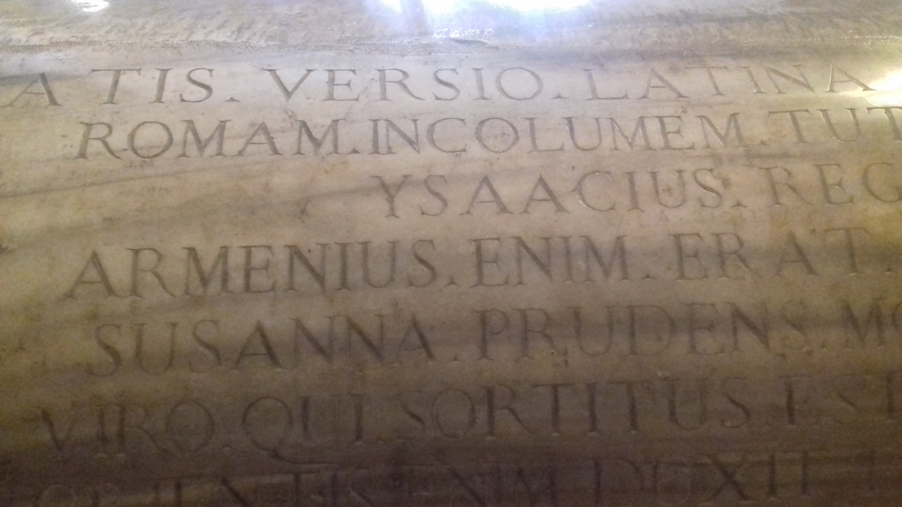 «Здесь покоится отважный стратег, хранивший Рим и Запад в неприкосновенности, Исаак Армянин из знатного армянского рода. С ним покоится его целомудренная супруга Сусанна в образе почтенной горлицы. Она непрерывно страдала после потери прославленного мужа, проявившего себя в боях в Леванте и на Западе; Экзарх Исаак командовал армиями Запада и Востока».