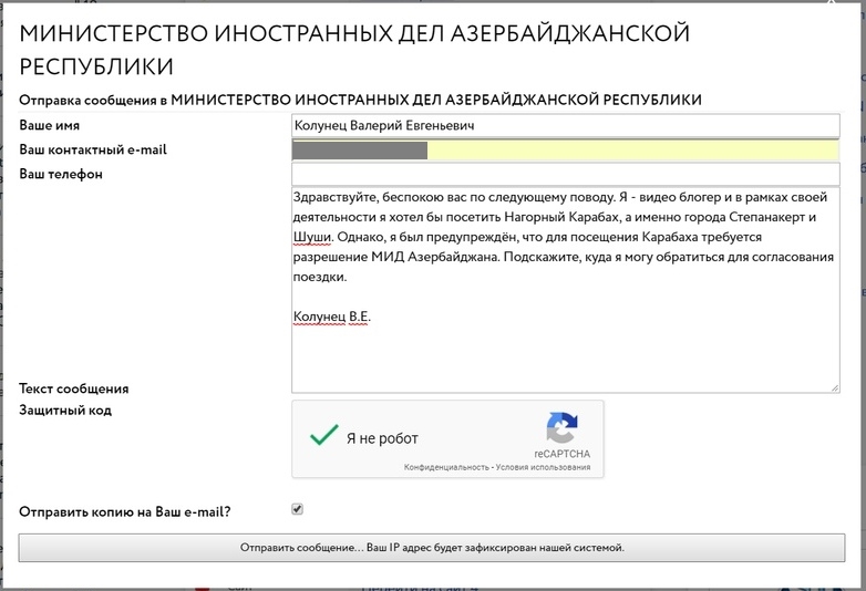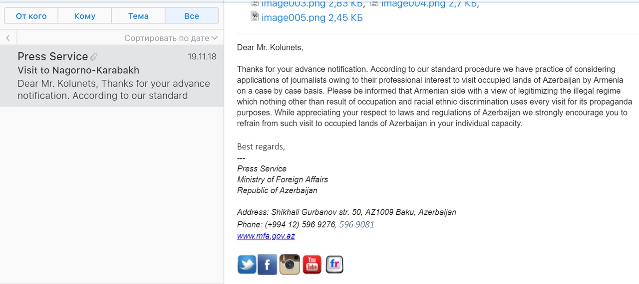 Ловко замаскировавшись под неармянина, я обратился с письмом в МИД Азербайджана, 19 октября 2018 года. Однако мой запрос на посещение Нагорного Карабаха так и остался без ответа. Веруя в добропорядочность восточных соседей я предположил, что возможно обращение поступило на неактуальный почтовый ящик и потому отправил повторный запрос, на другой адрес, указанный на сайте МИД Азербайджана. Однако, и на повторный запрос от 25 октября я так же как и в первый раз не получил ответ. Почти потеряв надежду 29 октября я был вынужден написать в третий раз на тот же адрес, но, увы, тщетны были мои ожидания. Я опустил руки расставшись со всякой надеждой когда-нибудь посетить сердце Азербайджана, прекрасный Карабах...